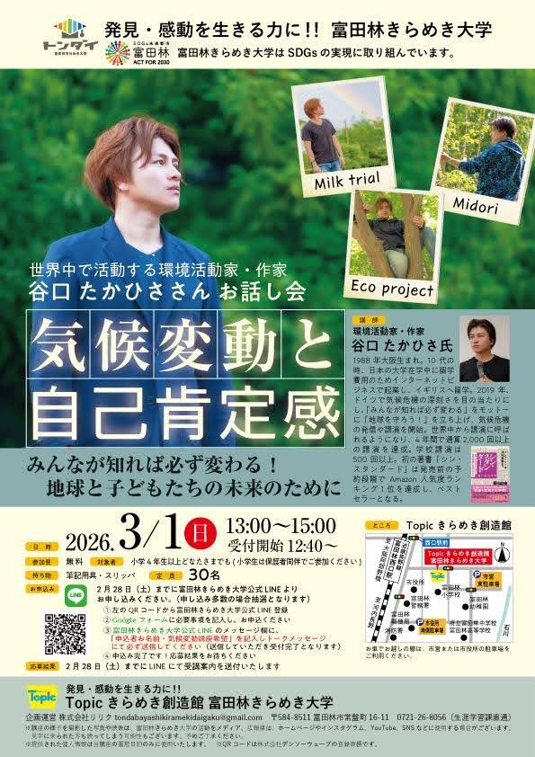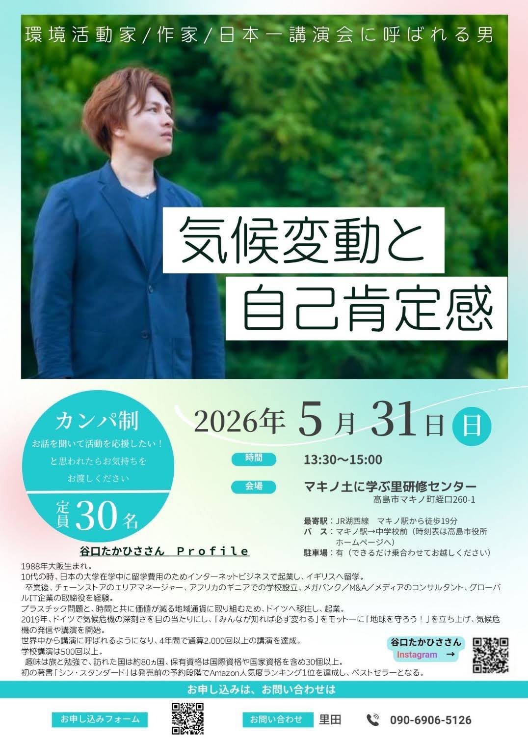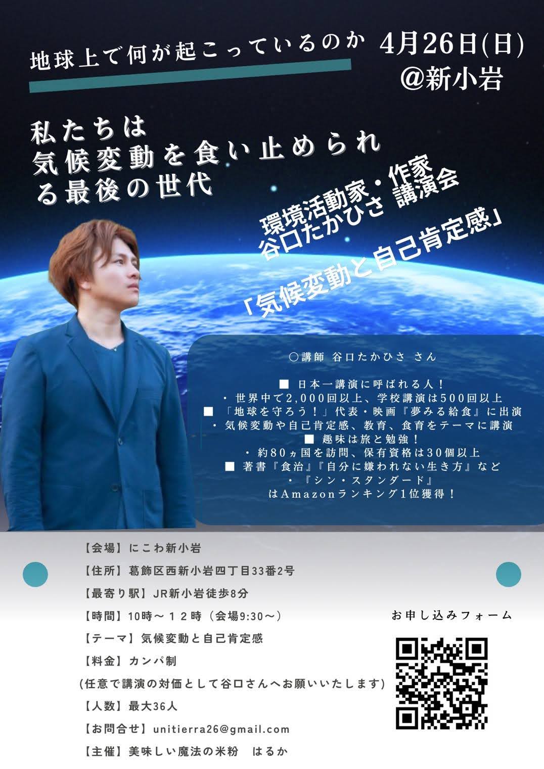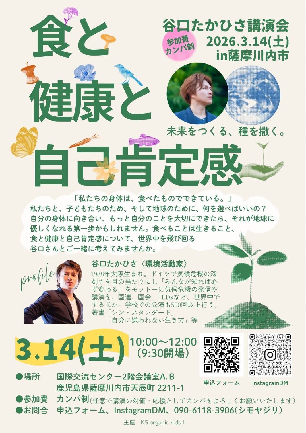 SCHEDULE. 谷口たかひさスケジュール 活動・講演会などのお問い合わせや取材のご依頼 読み込み中... EVENT. イベント・講演会 View All 講演会 近畿 谷口たかひさ お話会@滋賀県高島市 – 5/31 (土) 2026年5月31日(日) 13:30 - 15:00 土に学ぶ里研修センター 講演会 九州・沖縄 谷口たかひさ お話会@薩摩川内市 – 3/14 (土) 2026年3月14日(土) 10:00 - 12:00 国際交流センター 2階会議室A.B 講演会 北海道 谷口たかひさ お話会@旭川市 – 2/22 (日) 2026年2月22日(日) 10:00 - 12:00 認定こども園末広こまどり 講演会 近畿 谷口たかひさ お話会@富田林市 – 3/1 (日) 2026年3月1日(日) 13:00 - 15:00 Topic きらめき創造館 講演会 中部 谷口たかひさ お話会@愛知県名古屋市 – 2/13 (金) 2026年2月13日(金) 18:30 - 20:00 ウインクあいち (愛知県産業労働センター) 小会議室B 1209 (12階) 講演会 中部 谷口たかひさ お話会@愛知県尾張旭市 – 2/14 (土) 2026年2月14日(土) 13:30 - 15:30 新池交流館ふらっと 2階 会議室1~3